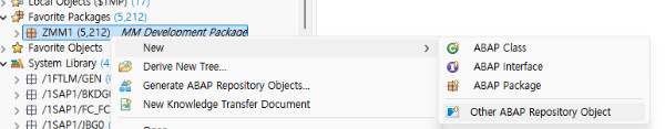 - 해당 패키지에 마우스 오른쪽 버튼을 클릭한 후, [ New → Other ABAP Repository Object ] 를 선택합니다.